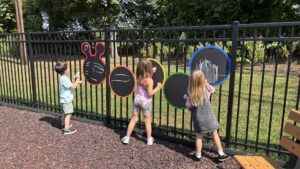 The light and spacious classrooms are on the main floor of the building, within easy access of the parking lot. A well maintained, fenced playground featuring a sandbox, climbing equipment, a seesaw, stepping stones, and a chalkboard is used during favorable weather. During inclement weather, playtime takes place in Fellowship Hall, where children ride tricycles, play with balls and hula hoops, and use the tumbling mat or balance beam. All doors to the church are locked for security during school hours.